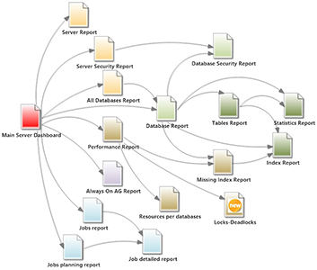 - Main Server Dashboard.rdl : main information and starting point, other reports are linked to this one (but they can be used also separately).
