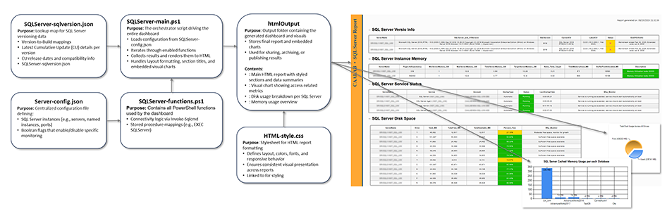This tool empowers technical teams to perform proactive system maintenance, validate audit readiness, and monitor SQL Server health, performance, and availability, all without relying on external integrations. The dashboard seamlessly connects to multiple SQL Server instances, executes targeted diagnostic queries, and renders structured visual and tabular data via a clean HTML interface.