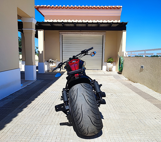 After deciding that a 300 wheel would be fitted in the end, a Harley Davidson wide rear wheel kit with custom rims and a 300 wide rear tyre and all the necessary modifications to the chassis and subframe, transmission, rear suspension, etc. was installed.