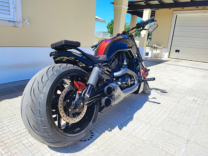 A Legend air suspension for Vrod models are other details to highlight in the modification of a Vrod like this one, together with the exhausts, number plate bracket, body parts, mudguards, seat and a lot of small elements are some of the components handmade by Lord Drake Kustoms for this VROD 300 BLACK&RED.